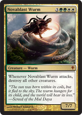 Novablast Wurm - Speaking of EDH, here is a question: have you been looking for a good sweep in your Gaddock Teeg deck but can't find a way around your general's restriction? Here you go. Not only great in casual formats, Novablast Wurm has a chance to be the best limited format card in Worldwake. A top pick in almost any scenario. A 7/7 unblockable creature that takes care of any other pests that might dare attack you. Novablast Wurm also signals the return of gold cards after.... wait for it.... two entire sets! That is about as long as WotC can keep its pants on in the multi-colored bedroom these days so perhaps we should be grateful. Besides, this is what gold is meant to do, produce extraordinary cards with a splash of colors together.