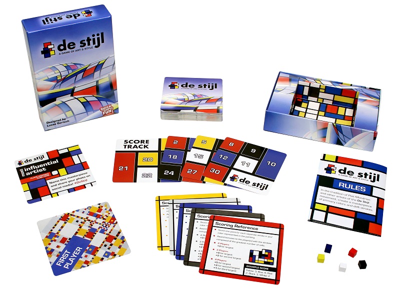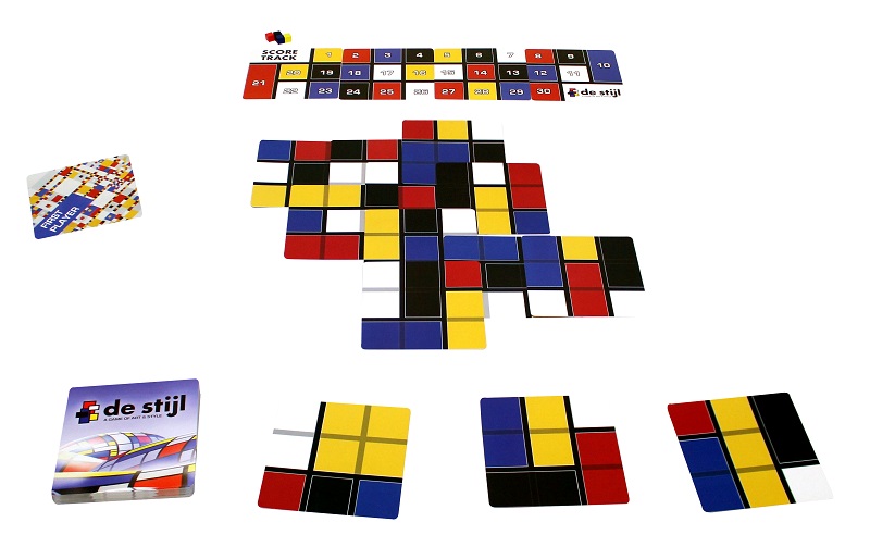 The De Stijl art movement, led by Theo van Doesburg and Piet Mondrian, sought out a means of expressing a sense of order and harmony. Artists of the movement incorporated a variety of artistic influences and media in an effort to develop a truly modern aesthetic. Mondrian's Neo-Plasticism, or New Plastic art, stripped away the traditional elements of art, such as perspective and representation, utilizing only primary colors and straight lines. De Stijl seeks to honor the legacy of the Mondrian style, putting the bold primary colors and straight lines on display in a quick, simple, and fun game for 2-5 Players!