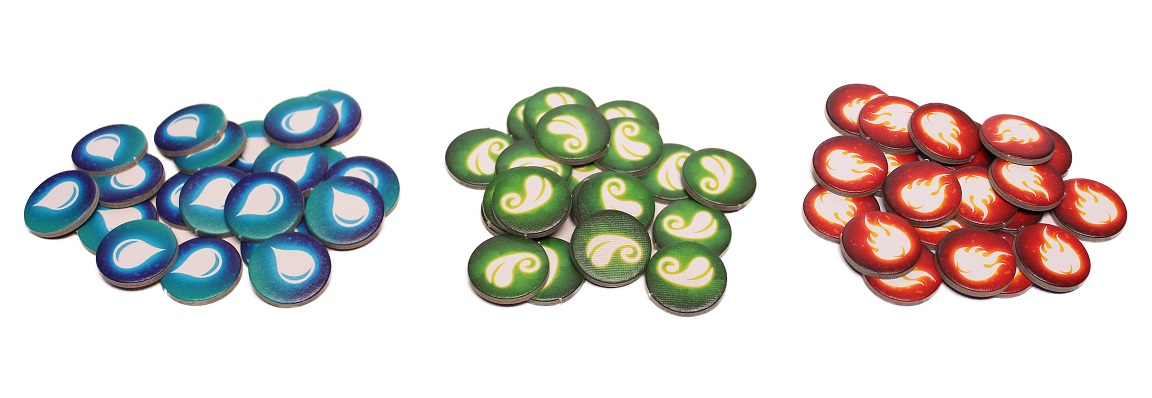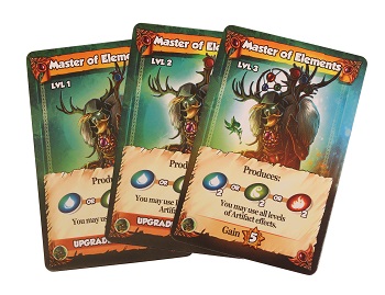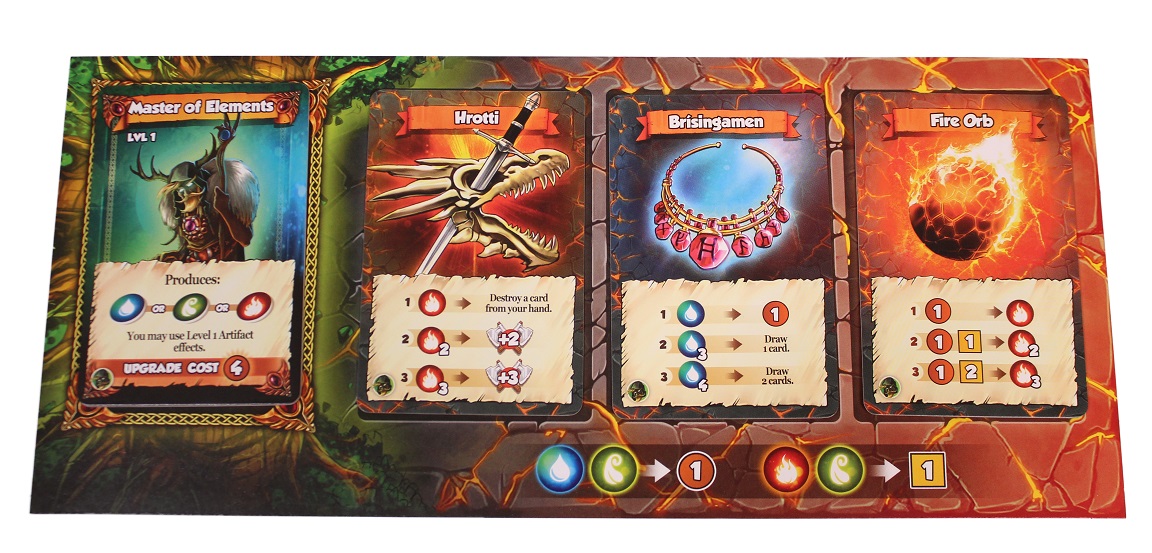 At the beginning of each game, players will draft three artifacts, picking from a selection of four artifact cards before passing those cards to the next player and picking a second artifact from the cards passed to you, and then a third. These chosen artifacts will be activated by the elements you produce throughout the game. As you level up your Master of Elements, your artifacts become more powerful, unlocking better versions of their abilities.